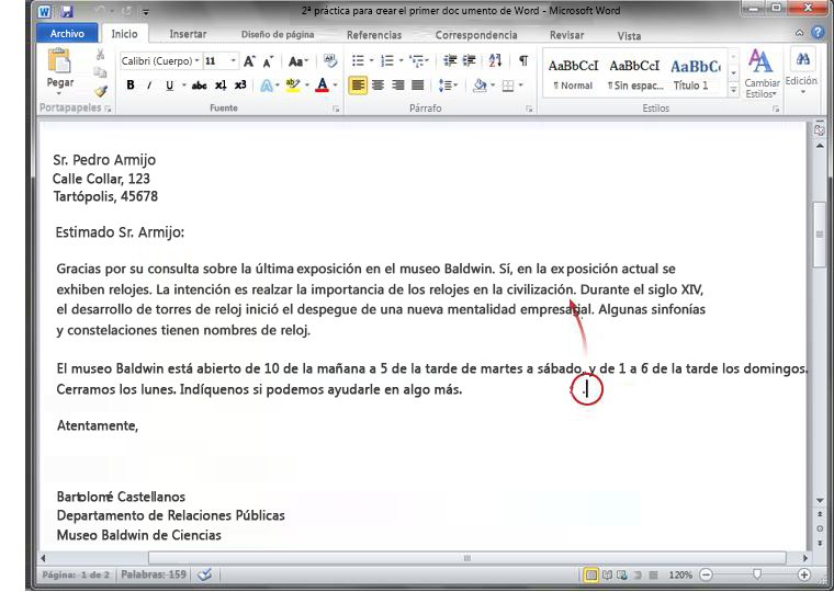 El cursor (la línea vertical) está al final del segundo párrafo, tras la palabra "ayuda". Para escribir en otro lugar del documento, debe mover el cursor a ese lugar. Le indicamos un par de formas para hacerlo: